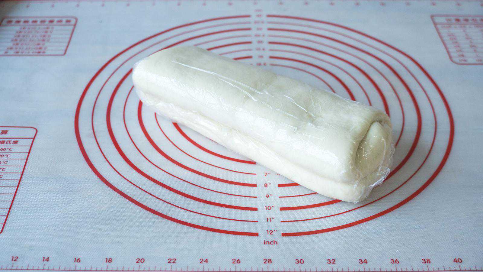8、10分钟后来擀面,底面朝上,光滑面朝下,按扁,把擀面杖放在面团中间,往上面擀一下,再放回中间往下面擀一下,不要来回擀,会破酥,卷起来,全部卷好后同样的盖保鲜膜松弛10分钟,这是最后一次松弛了;