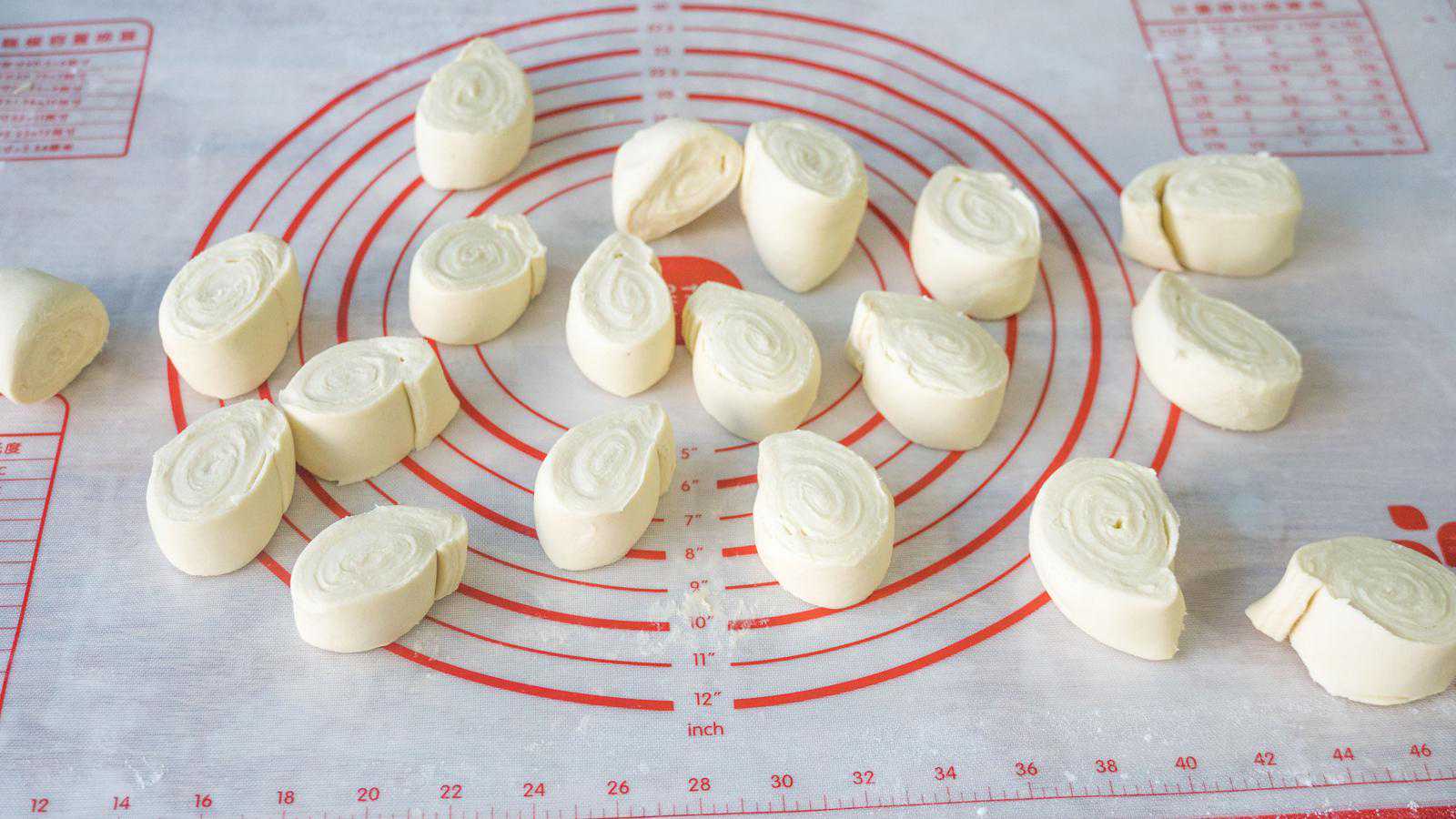 5、加油揉继续揉光滑,然后搓成长条后分成小剂子。然后先搓圆,再摁扁。