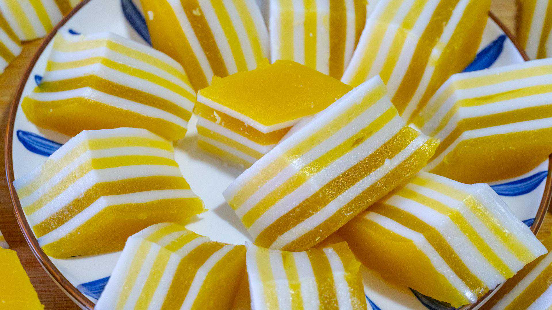 后面都是一样的,一层黄色一层白色,最上面和最底下都用黄色的粉浆,这样蒸出来的颜色更好看一些。