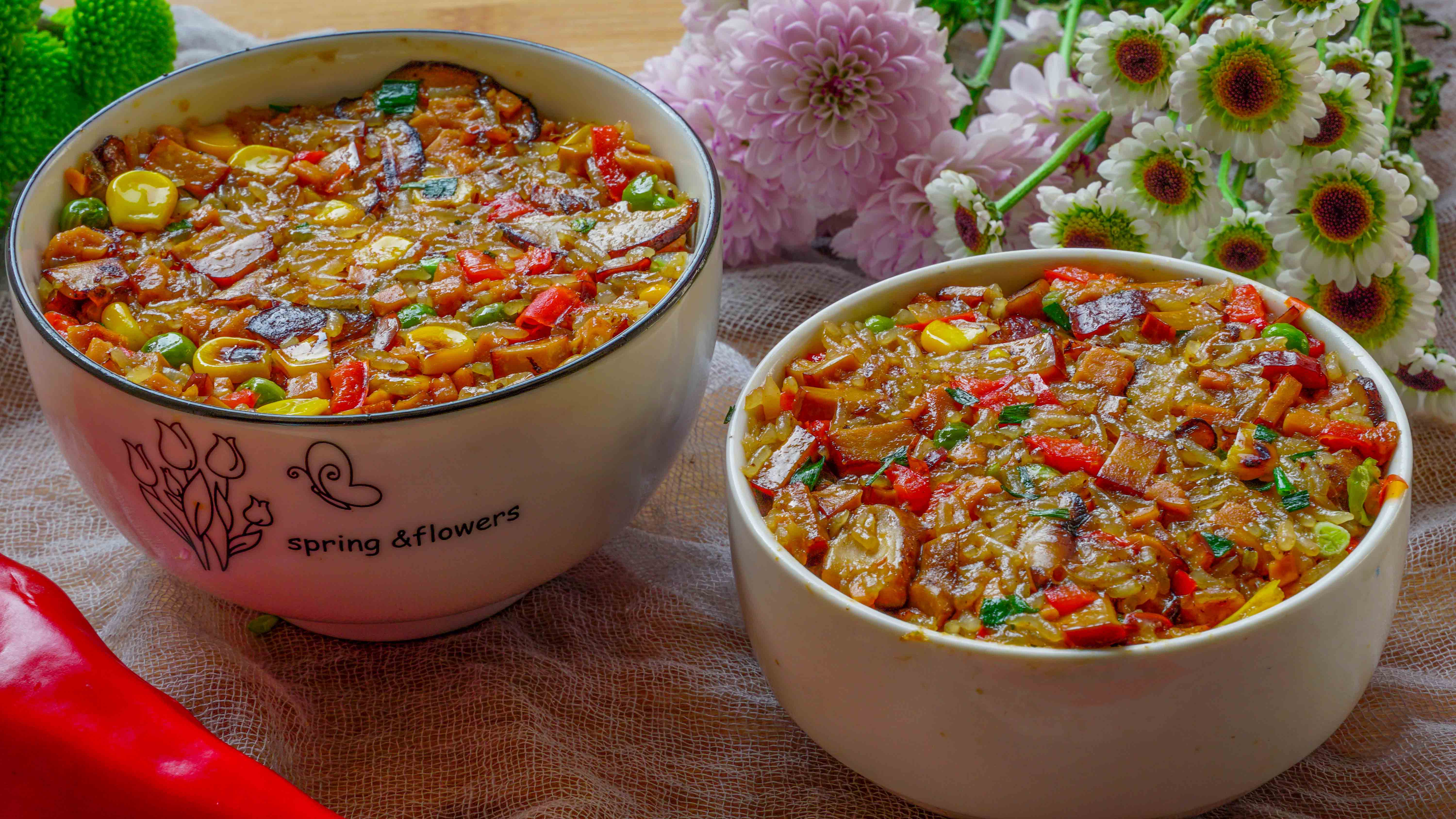 7、记得用开水,而且一次不要加太多,分几次加,盖上锅盖焖一会儿。每一次焖3分钟左右,焖3次就差不多熟了,加点生抽,胡椒粉,其他的调料就不用放了,火腿肠和辣椒也加进去,继续翻炒一会儿就差不多可以出锅了。