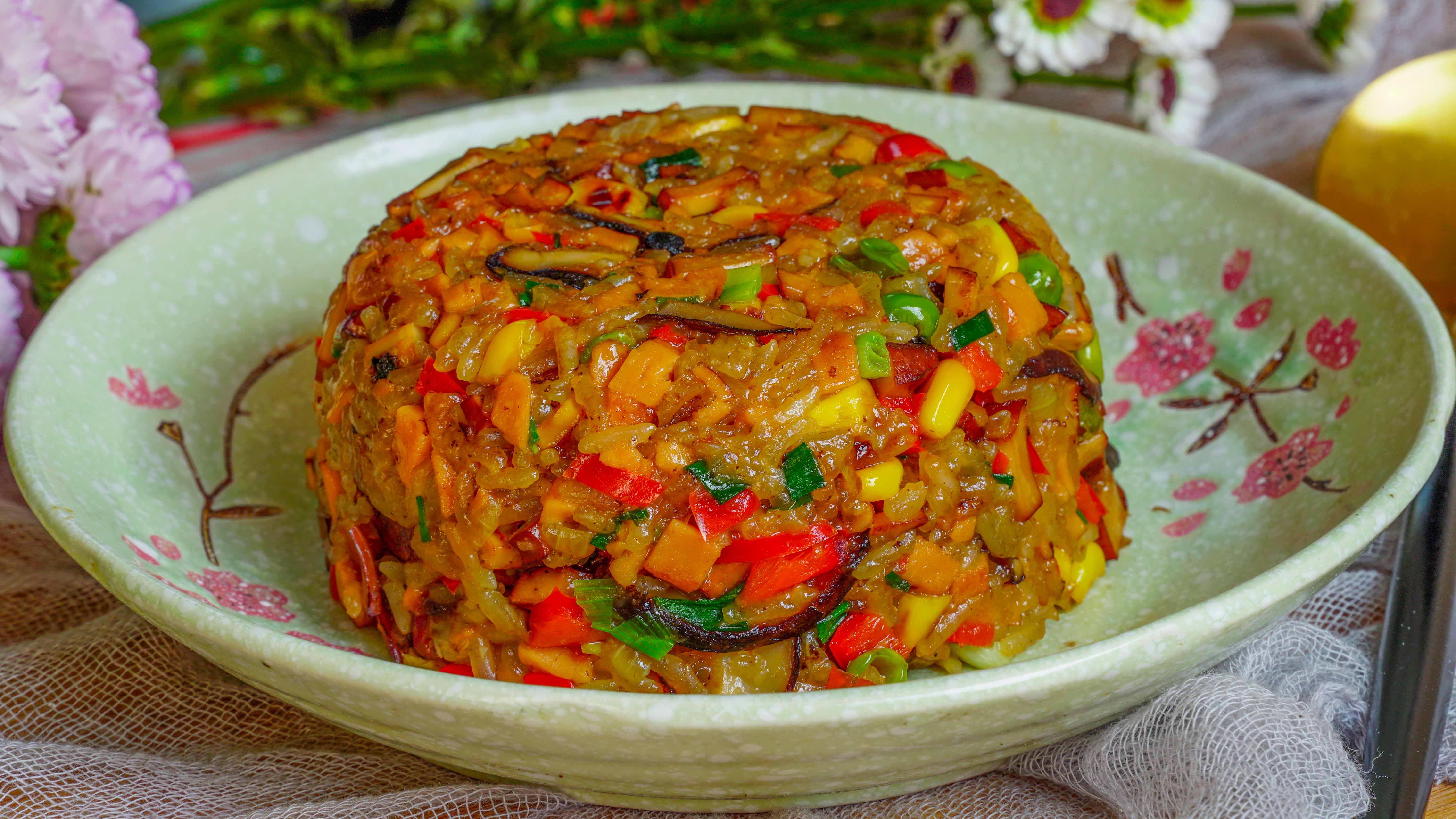 8、出锅前再来一把葱花,看起来真的太诱人了,有点迫不及待地想尝一口,因为糯米提前泡了一夜,除了特别容易熟以外,口感上也是不用多说,特别的软糯,搭配多种蔬菜和香菇,除了营养满满以外真的特别香,强烈建议大家试一下哦。