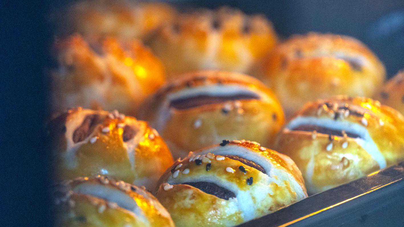 烤的时候就闻到香味儿了,出炉啦,颜色的确是超级漂亮,金黄焦脆的看起来就特别诱人,迫不及待的尝了一个,真的是超级酥,一碰就会掉渣的这种,豆沙的甜度也是刚刚好,吃起来完全不会觉得腻;