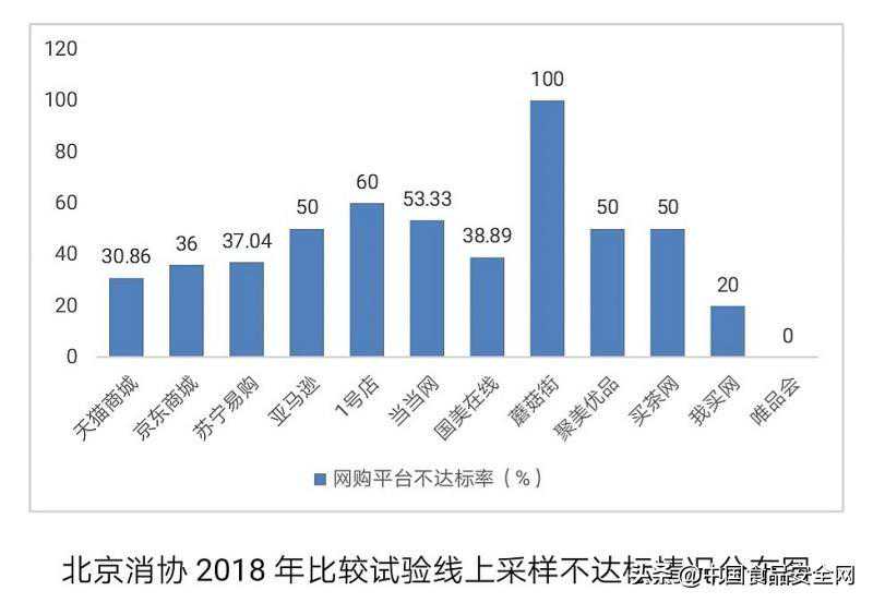 据北京阳光消费大数据研究院统计,北京市消协2018年共测试商品样品864个,其中线上采样432个,不达标160个,不达标率37.04%;线下采样432个,不达标66个,不达标率15.28%。线上采样不达标率是线下的2.42倍。线上采样主要来自天猫商城、京东商城、苏宁易购、国美在线、亚马逊、一号店、聚美优品、唯品会、当当网等电商平台。