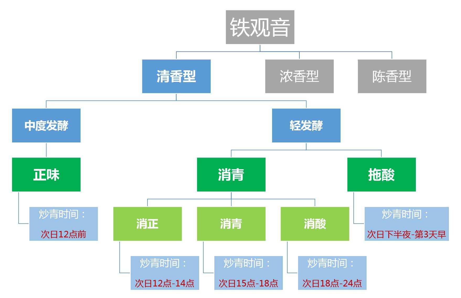 清香型铁观音的工艺,根据不同的杀青时段,又分为: