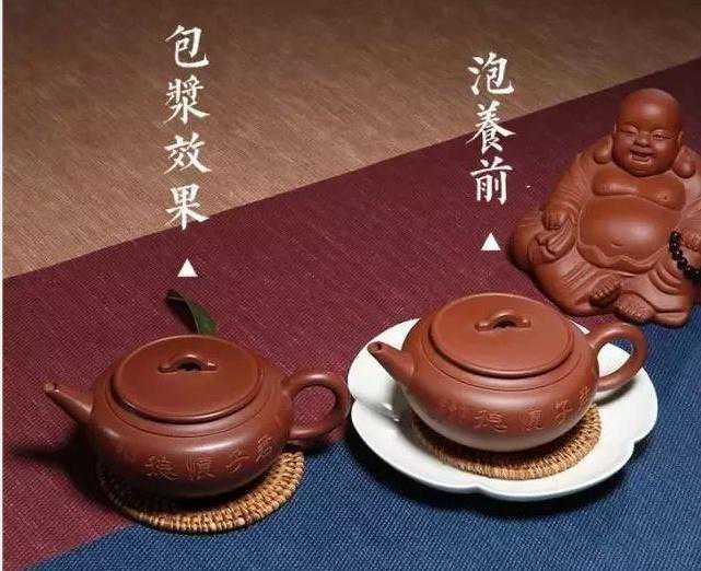 壶的表面会积有茶渍.这就需用养壶毛笔或软毛牙刷在壶表面轻轻刷洗,以保持清洁。如此擦拭、涤洗久了,壶的表面会起一层亚光,人称其为“包浆”(葆浆),这种亚光不会因高温高压冲洗而褪去,甚显高雅品位。