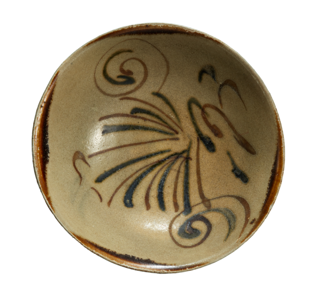 唐代长沙窑大量烧造釉下彩绘瓷器。这盏长沙窑青釉褐彩云气纹瓷碗内外施青釉,器外壁以四块褐斑装饰,外壁釉不及底。碗心以釉下褐彩勾描云气纹,褐彩线条内涂釉下绿彩,整体图案线条流畅。它突破了青瓷的单一釉色,丰富了唐代瓷器的装饰技术,开创了釉下彩瓷器的先河。