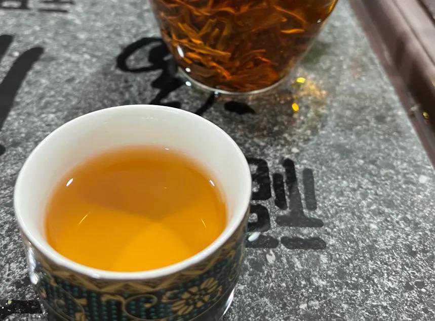 它的干茶条索粗壮,秀丽紧结,大小比较匀整,色泽乌润,茶条表面有明显金毫;经过100℃的开水冲泡后,茶汤呈现橙黄色,清澈透亮,没有杂质。