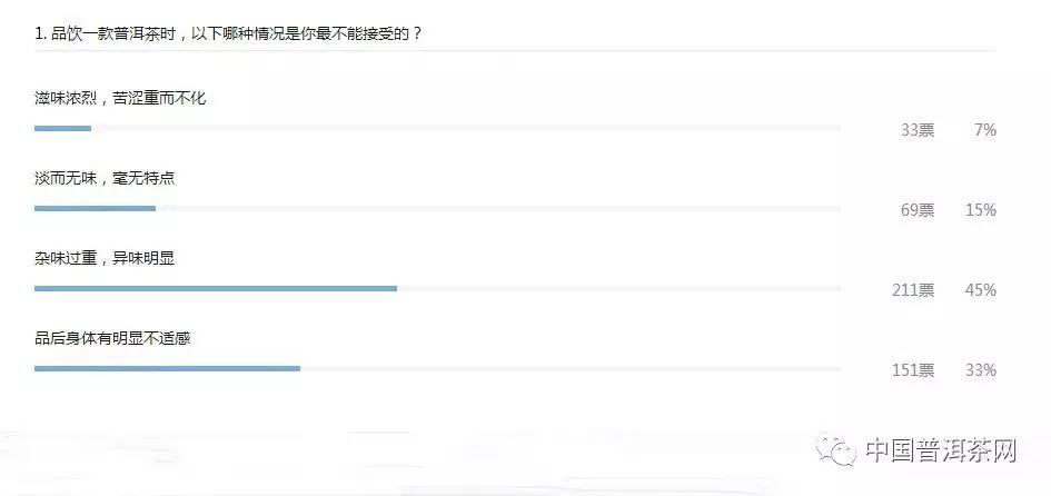 那么什么样的口感是消费者最不能接受的呢?从投票结果来看,有杂味、异味或是品后身体不适的茶是最让人难以接受的,这也就意味着一款茶喝后是否感到舒服十分重要。