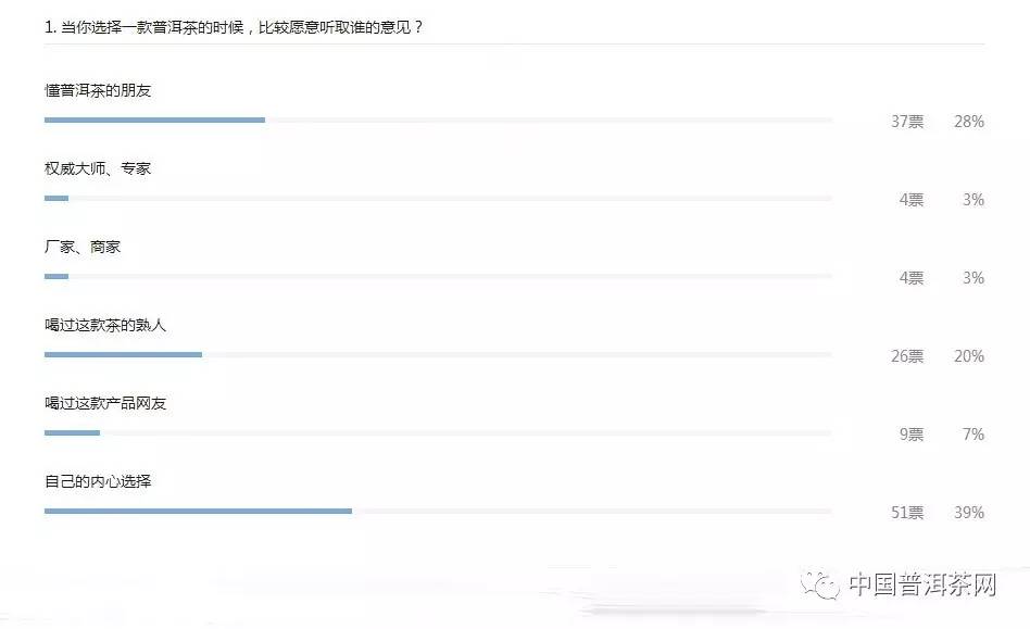 在最后一期投票中发现,一大部分人选择一款普洱茶时是不太愿意听取别人的意见的,而是遵循自己内心的选择,即使要询问意见,也会比较相信懂普洱茶的朋友或是喝过这款茶的熟人,这样就意味着那些忽悠大师、专家在消费者眼里并没有那么“可信”。
