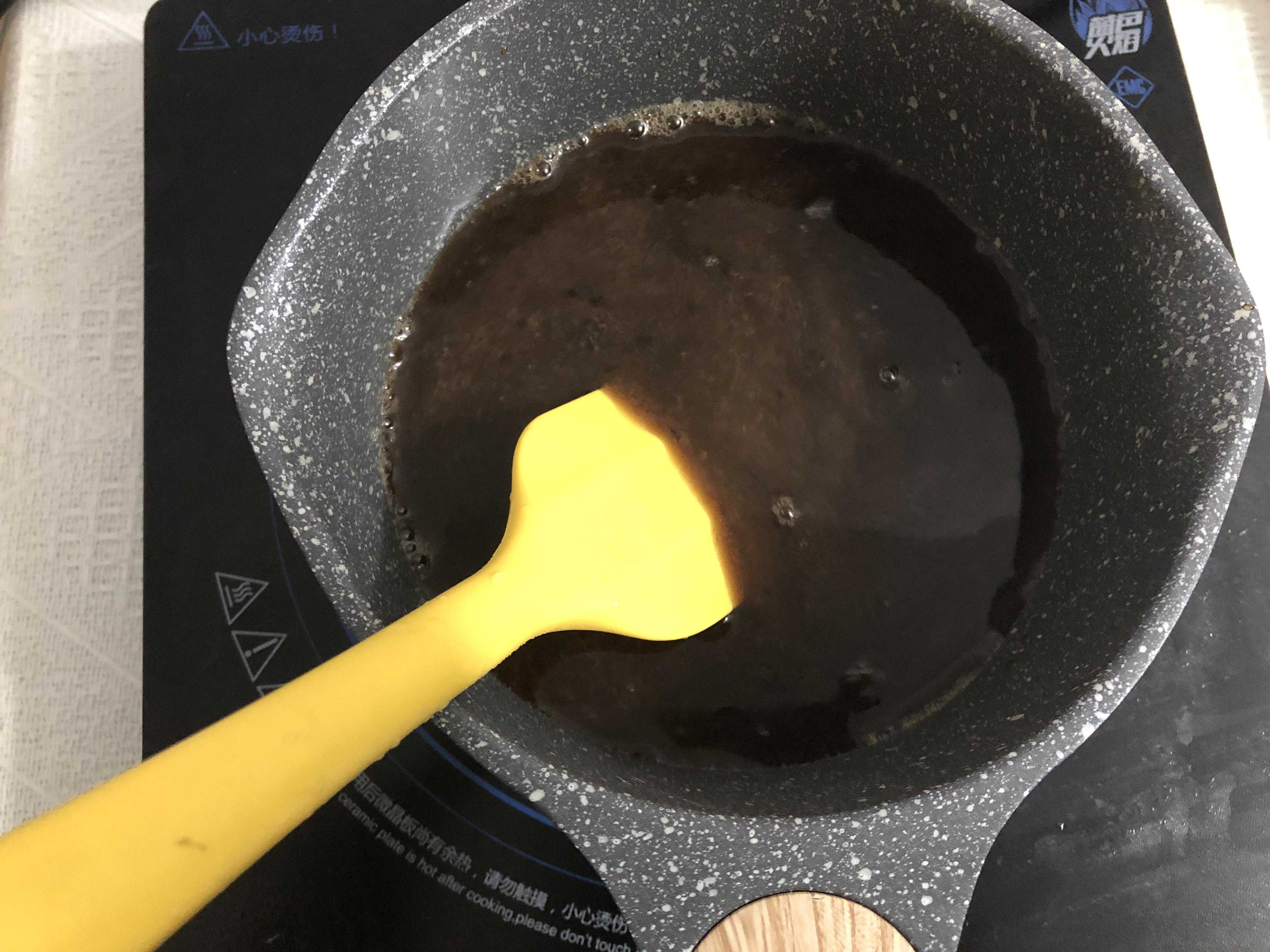 第二步:将调好的烧仙草溶液倒入锅中,一边加热一边搅拌直至煮开。