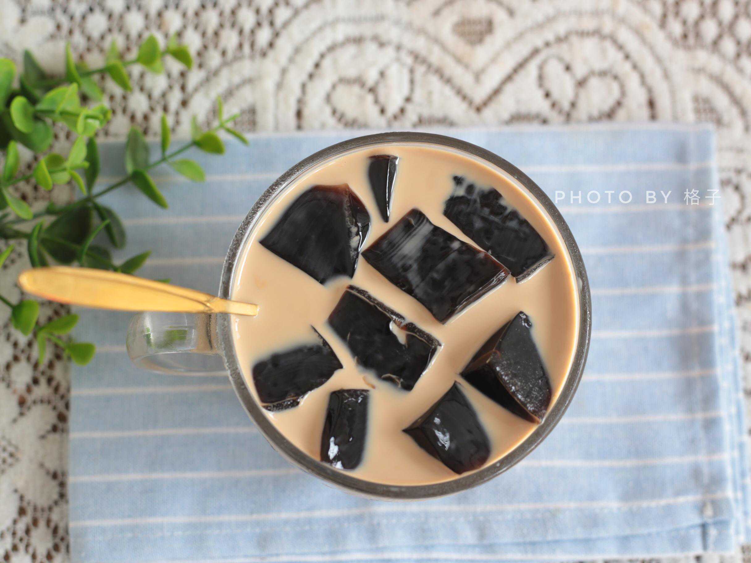 【材料】烧仙草粉:20克、清水:400克、牛奶:300毫升、红茶叶:5克、白砂糖:15克