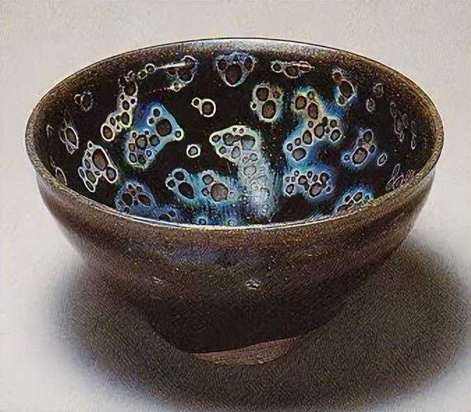 图中这只“油滴”天目茶碗是古往今来油滴天目中的最好的极品,有“碗中宇宙”之称,原是日本関白秀次所有,后经过西本愿寺、三井家、若狭酒井家流传至今,现藏于日本东洋陶磁美术馆。