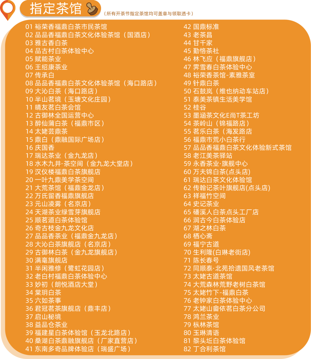 目前,已公开招募到82家“开茶节指定茶馆”和“民间推介官”。开茶节活动期间,遇见挂有“第十三届福鼎白茶开茶节指定茶馆”旗帜的茶馆可免费品饮,期待您的探店!