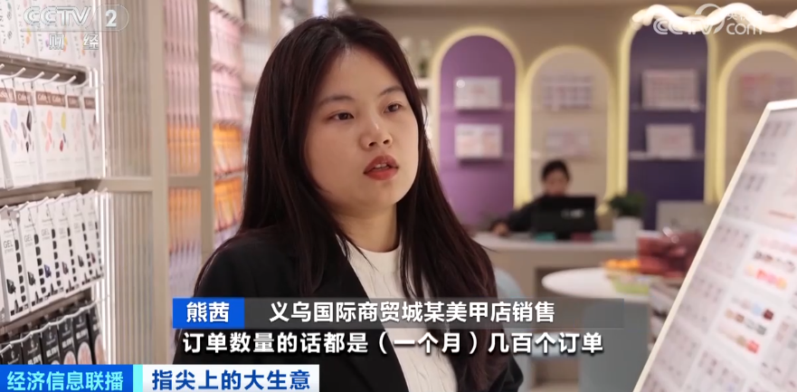 义乌国际商贸城某美甲店销售熊茜:一个月有几百个订单,经常会有款式上的更新,我们也可以按照客户图样去定制。