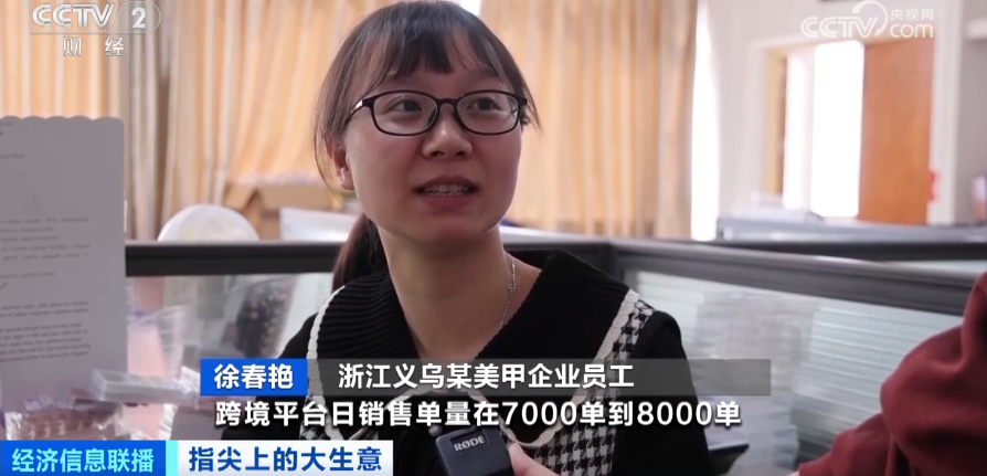 浙江义乌某美甲公司员工徐春艳:线上月销售额达近百万元,跨境平台日销售量在7000单到8000单。