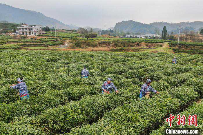 3月27日,走进江西九江修水县大椿乡的一处茶园,只见一株株茶树整齐划一排列,绿意盎然,蔚为壮观。清明节将至,当地茶农正忙着采摘“明前茶”。大椿乡现有茶园面积约14000亩,是修水县目前茶叶种植规模最大的乡镇。大椿乡把茶产业作为促进乡村振兴和群众致富的支柱产业培优培强。修水县是“中国名茶之乡”,现有茶园面积约23万亩,“宁红茶”“双井绿”是该县的两大名茶。