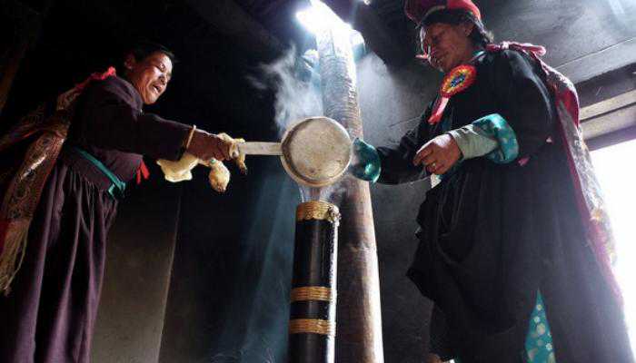 在藏族家庭中,几乎家家必备茶叶,藏族女孩从小就学习打酥油茶——煮好浓茶,滤掉茶叶,在茶水内加入酥油、奶酪、盐,上下搅拌到茶乳相融,一日三餐随时饮用。甚至放牧时节,也不忘三块石头支口锅,把酥油茶熬起来。