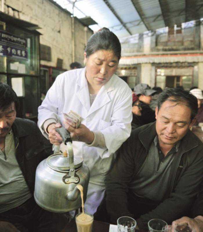 先是作为一种珍贵的医疗保健品在吐蕃王室中使用,后来唐蕃进一步交流,藏地僧人也学会了内地烹茶、饮茶之法。而藏族民众对僧人十分崇敬,纷纷效仿他们的饮茶习惯。茶叶亦逐渐与藏人的饮食起居融合,成为民生之茶。