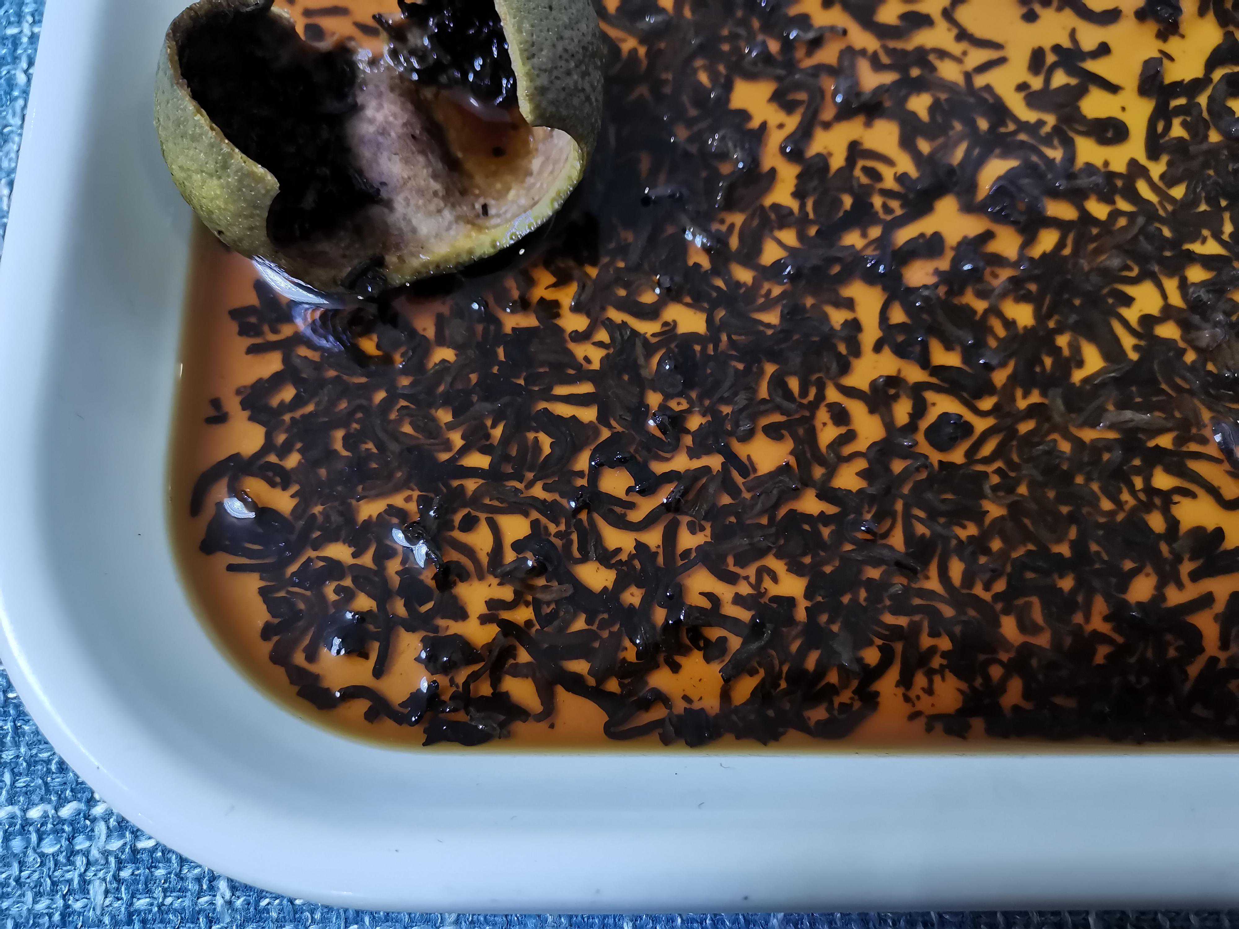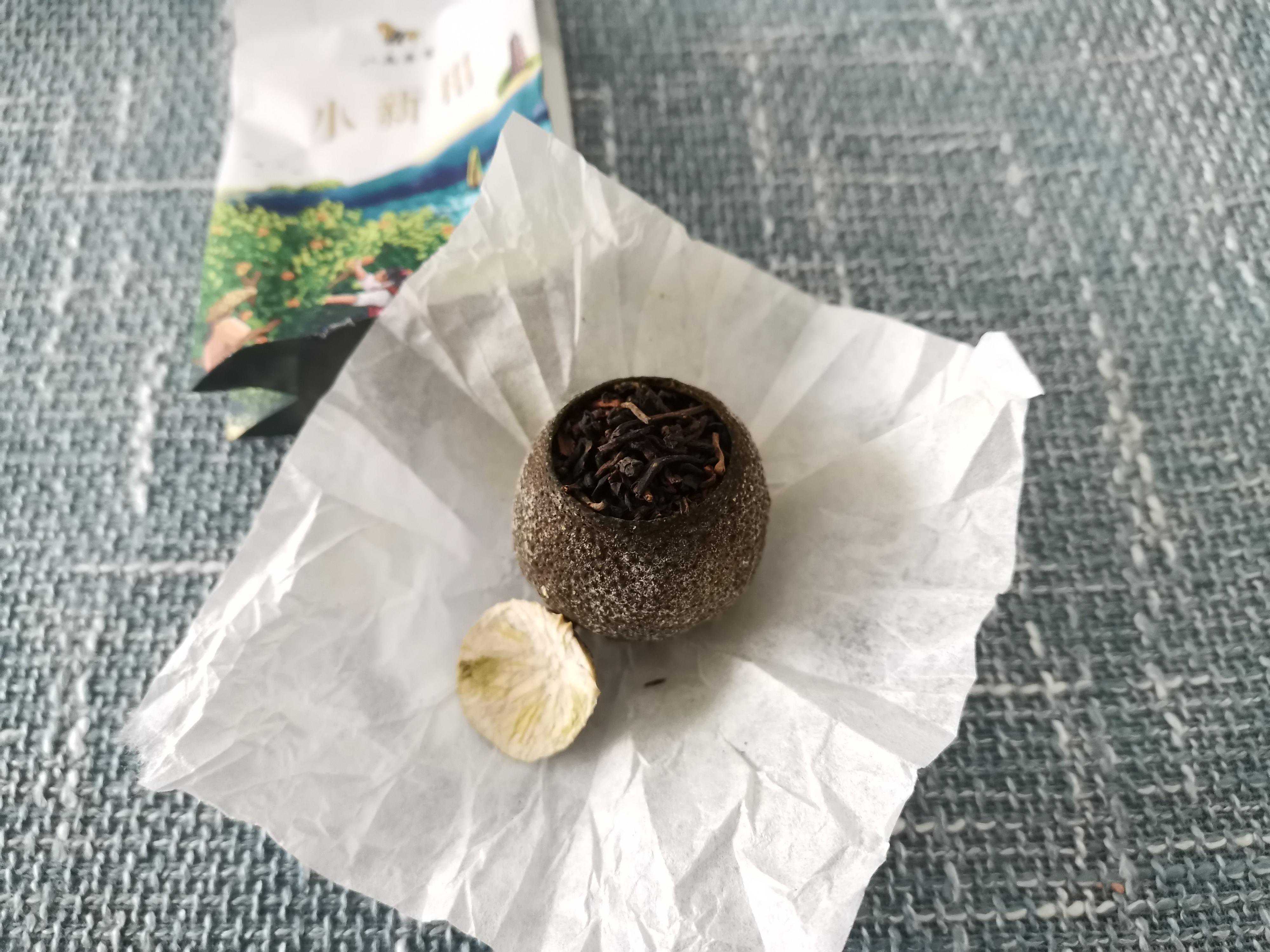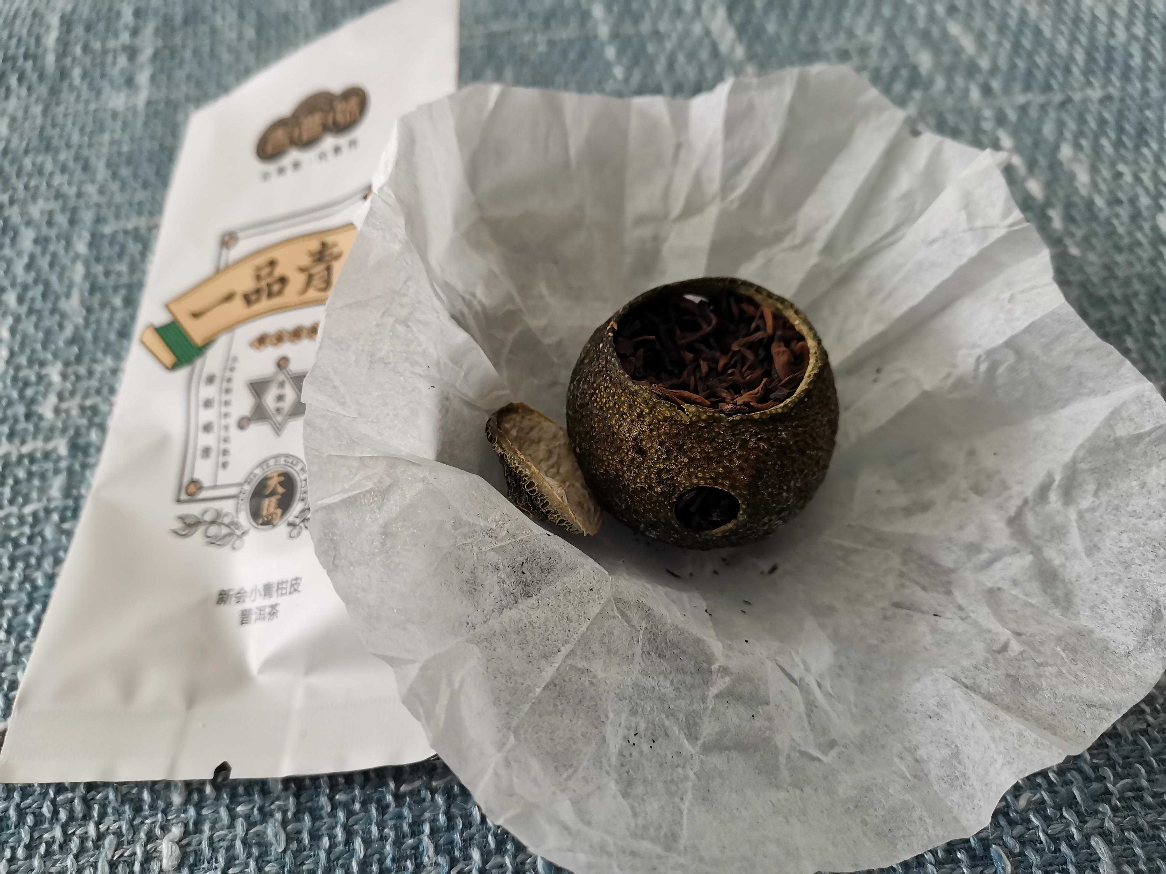 在开始之前,介绍一下小青柑的一些知识,小青柑又叫柑普茶,用广东新会出产的小青柑加上云南熟普制成,小青柑的果香加上普洱的茶香互相融合,形成独特的口感。再看知乎上面关于小青柑的回答时,发现不少知友都说到了塞到小青柑里面的熟茶品质差。在买的时候也看到各个品牌的介绍,用的不是宫廷料,就是早春茶,所以我在泡好之后把柑皮给剪开了,来仔细地看看叶底,是否如商家所说的都是好料子(有个品牌看着真的有点让人失望)。