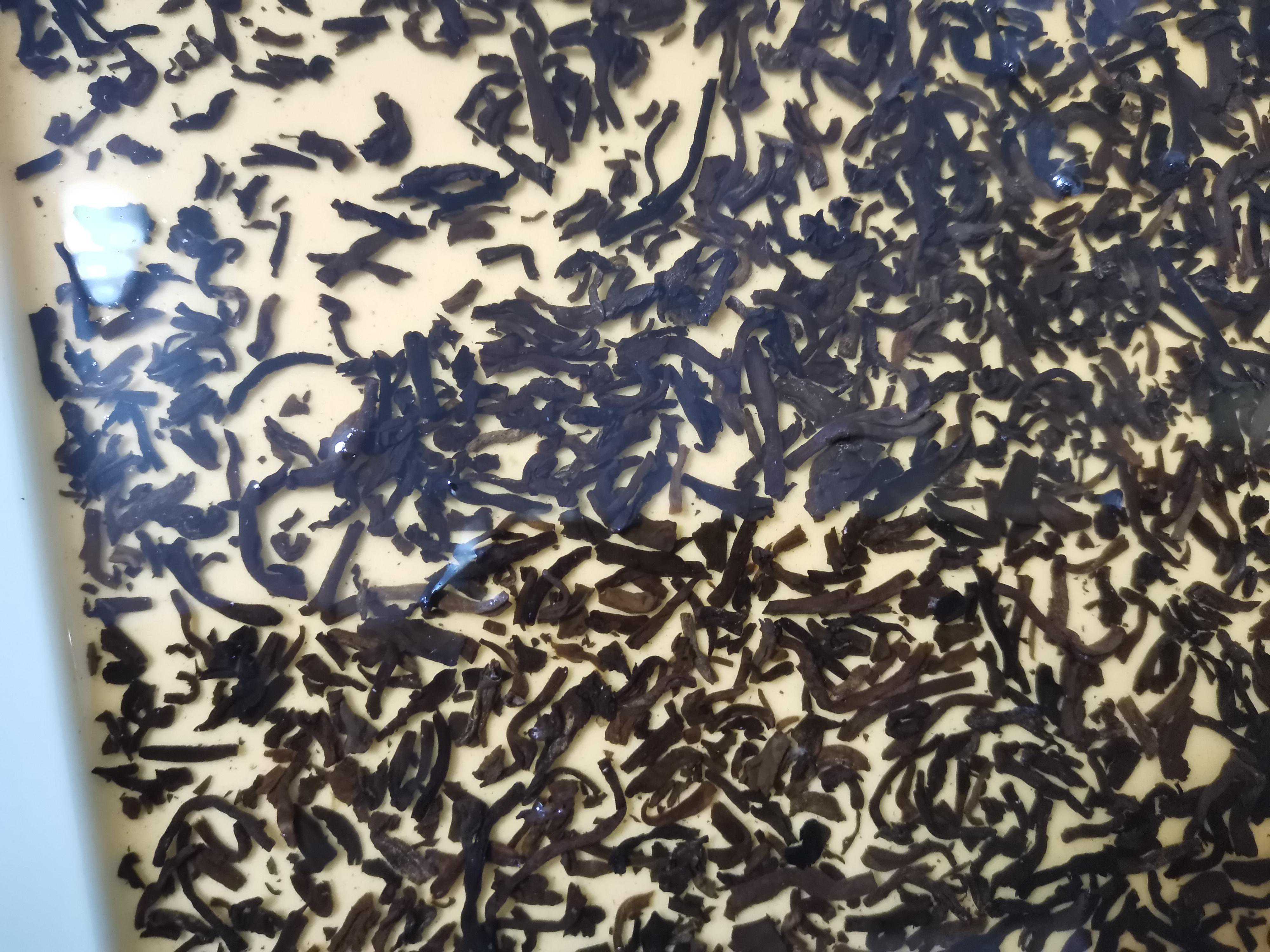 形状基本完整,叶底有韧性,闻上去有一股淡淡的陈皮药香和茶香。