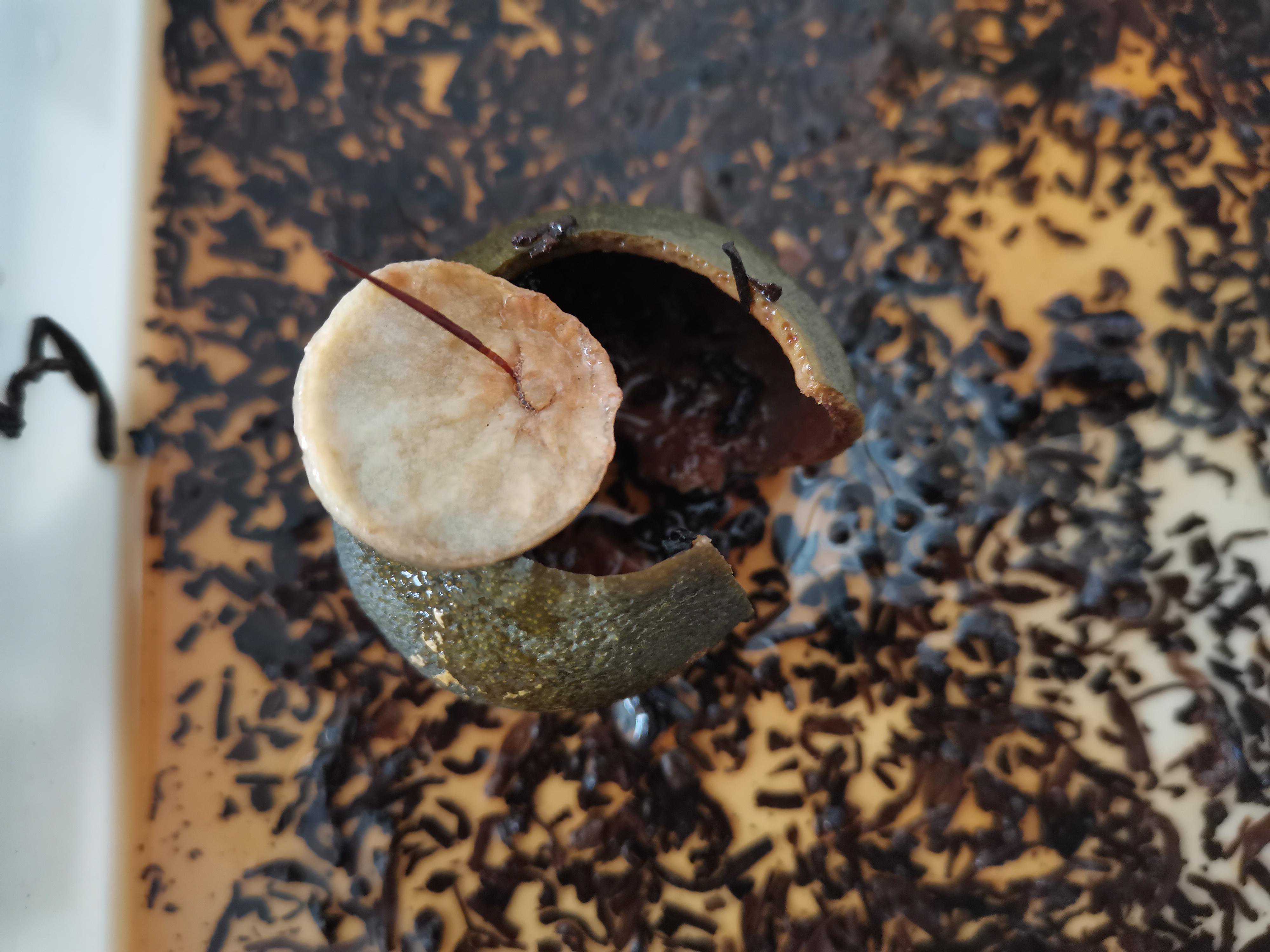 小青柑香是真的香,拆开铁罐包装就能闻到一股浓郁的柑香了,拆开之后陈皮药香就更加明显了。柑的表面有白霜,为了方便看里面的熟茶,我拆开了一颗小青柑(柑皮较硬,不好拆),大家可以看看干茶。