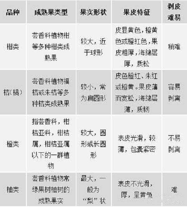桔、橘、橙、柚特性对比表: