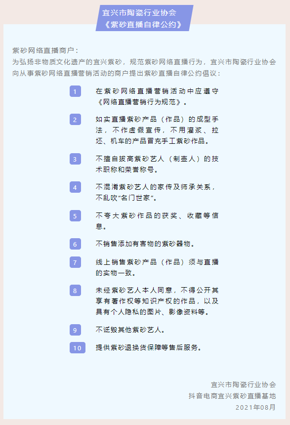 所以,各大直播间热销的壶,是否是全手和半手壶都无法分辨,从售价上,太便宜的可以默认为机车壶。其实,去年8月,宜兴市陶瓷行业协会就联合抖音发布了《紫砂直播自律公约》,其中第二条就规定:如实直播紫砂产品(作品)的成型手法,不作虚假宣传,不用灌浆、拉坯、机车的产品冒充手工紫砂作品。