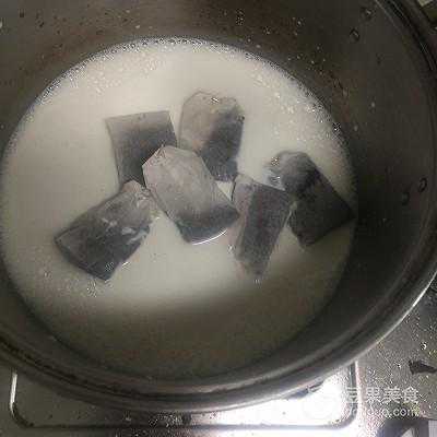 5、牛奶和红茶包煮开关火焖5分钟。放适量白糖以自己喜欢的甜度为宜。