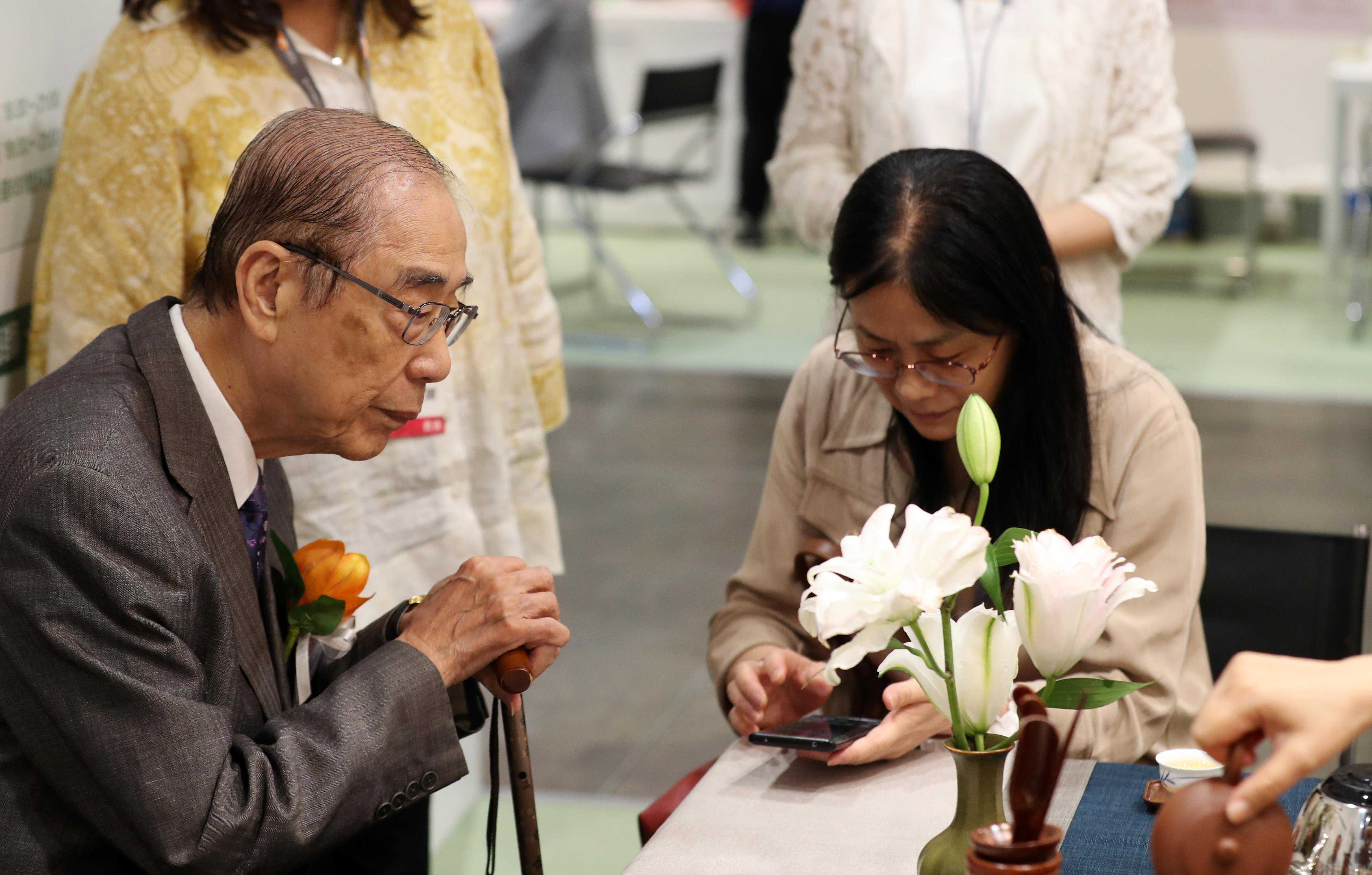 香港中国茶文化国际交流协会会长杨孙西(左)接受新华社记者采访(8月17日摄)。新华社记者李钢摄