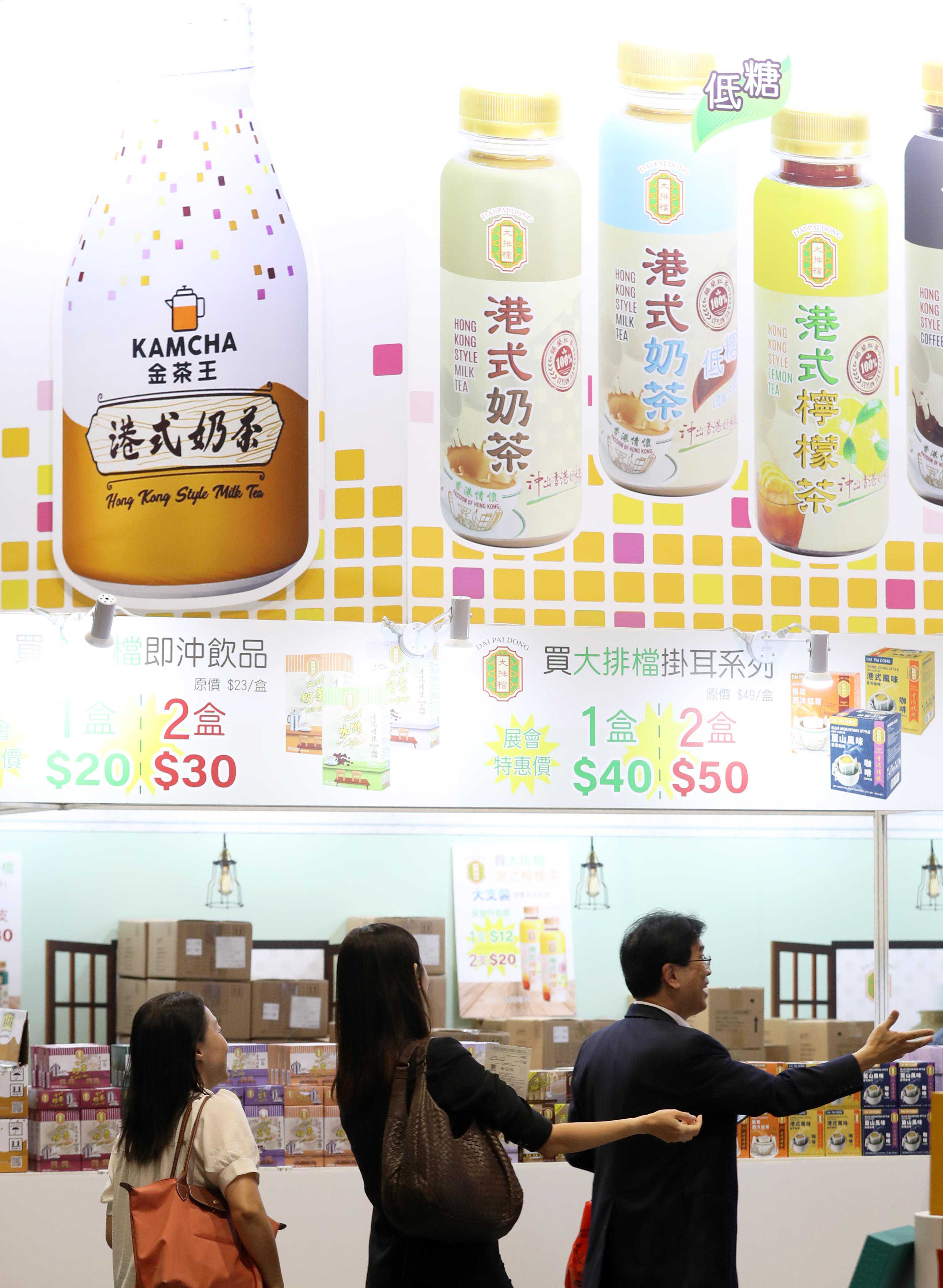 在香港国际茶展上拍摄的港式奶茶展位上的宣传海报(8月17日摄)。新华社记者李钢摄