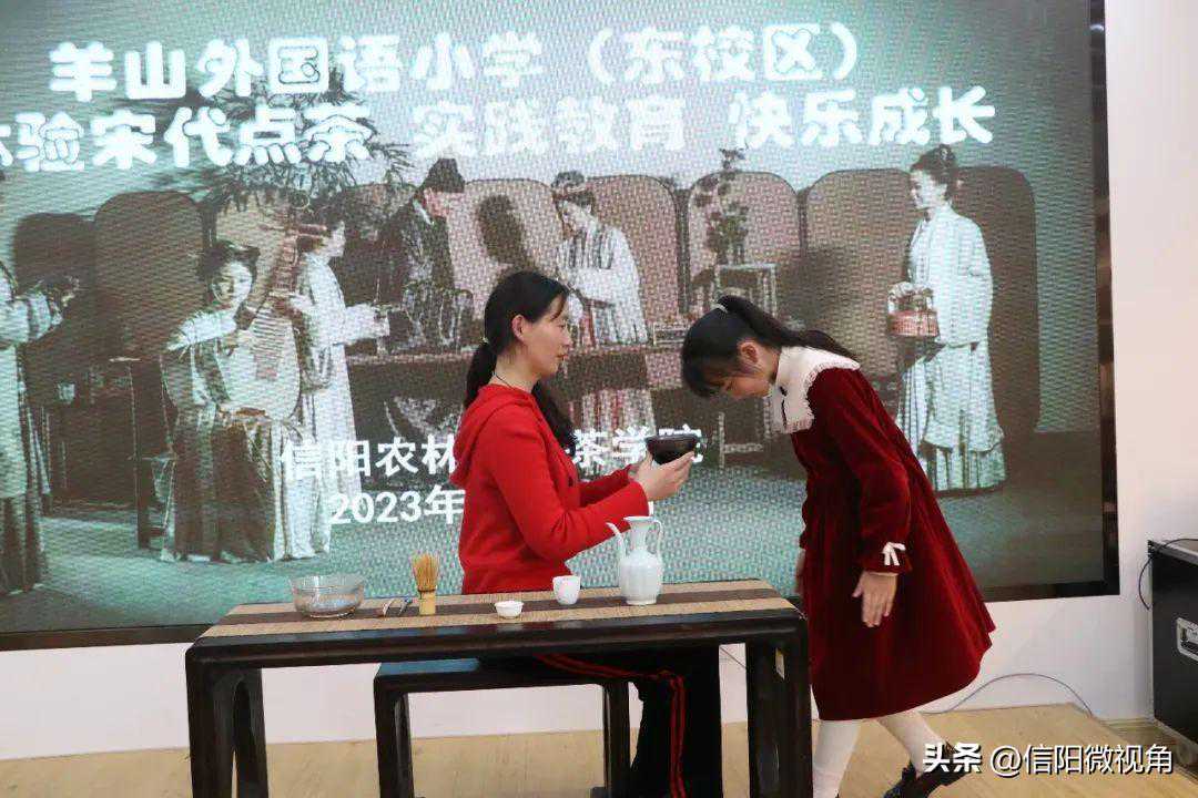 宋代点茶形成于五代宋初,流行于两宋时期,鼎盛于宋徽宗时期。点茶不仅是传统技艺,还具有一定的社交意义,衍生出了“斗茶”“茶百戏”等表现形式,为文人雅士所推崇,极大丰富了宋代的思想文化生活。这个春天,羊山外国语小学东校区二(7)班七色花中队的小先生化身宋代小茶人,走进信阳农林学院茶学院,体验一场从身到心的听茶、点茶、赏茶、奉茶之旅。