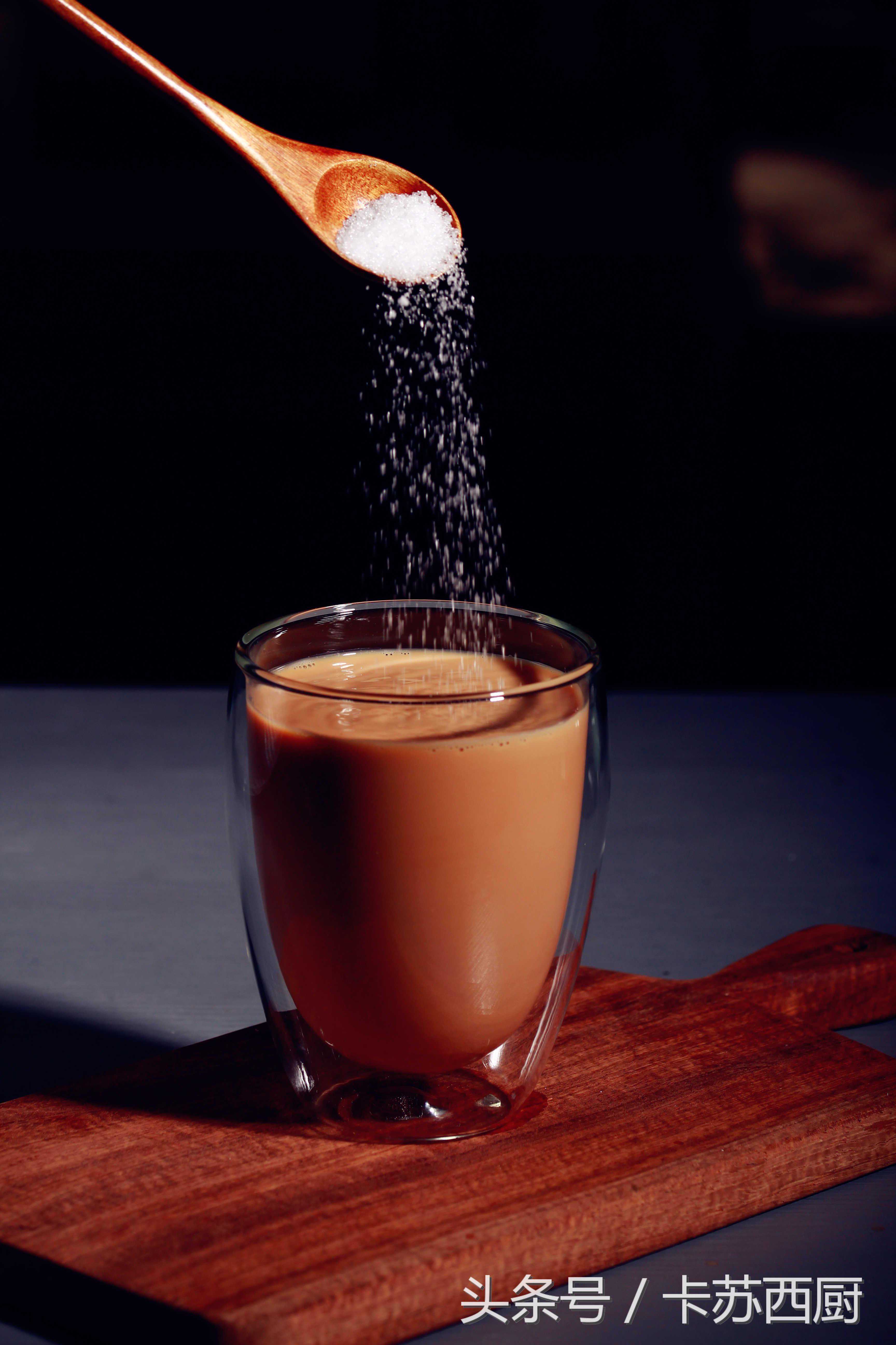 奶茶的制作在350ml的杯子中装入70ml淡奶,砂糖20克,从约20-30厘米的高处冲入200ml港式红茶汤。