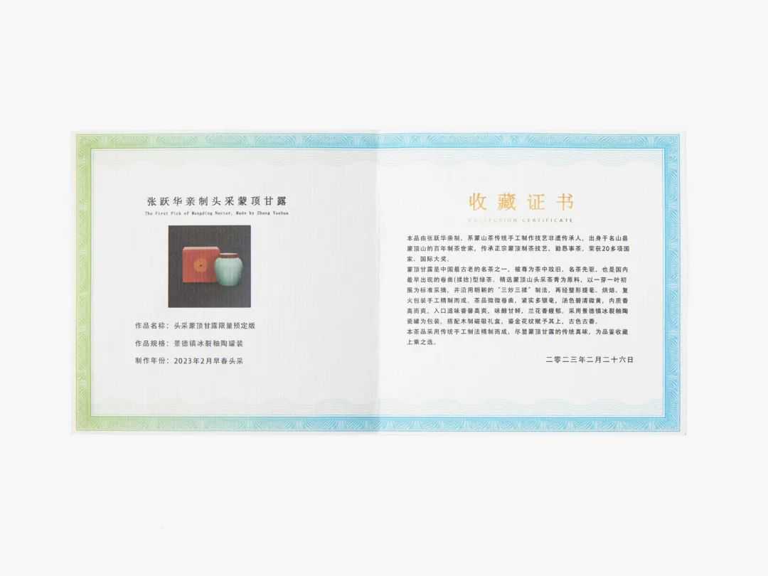 “头采”款,内附有相应的珍藏证书,包含了茶品信息、采摘量、匠人介绍等。