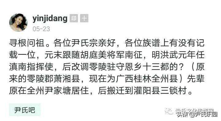 广西:yinjidang查证如下:一、经过云南方面查询:广西桂林市恭城县嘉会镇吉山村尹氏:原籍江西省吉安府吉水县猪屎巷。开基祖思贤,明朝初期随统军胡庭美为先行官,率骑兵进入广西平乱,后定居恭城平安乡路......