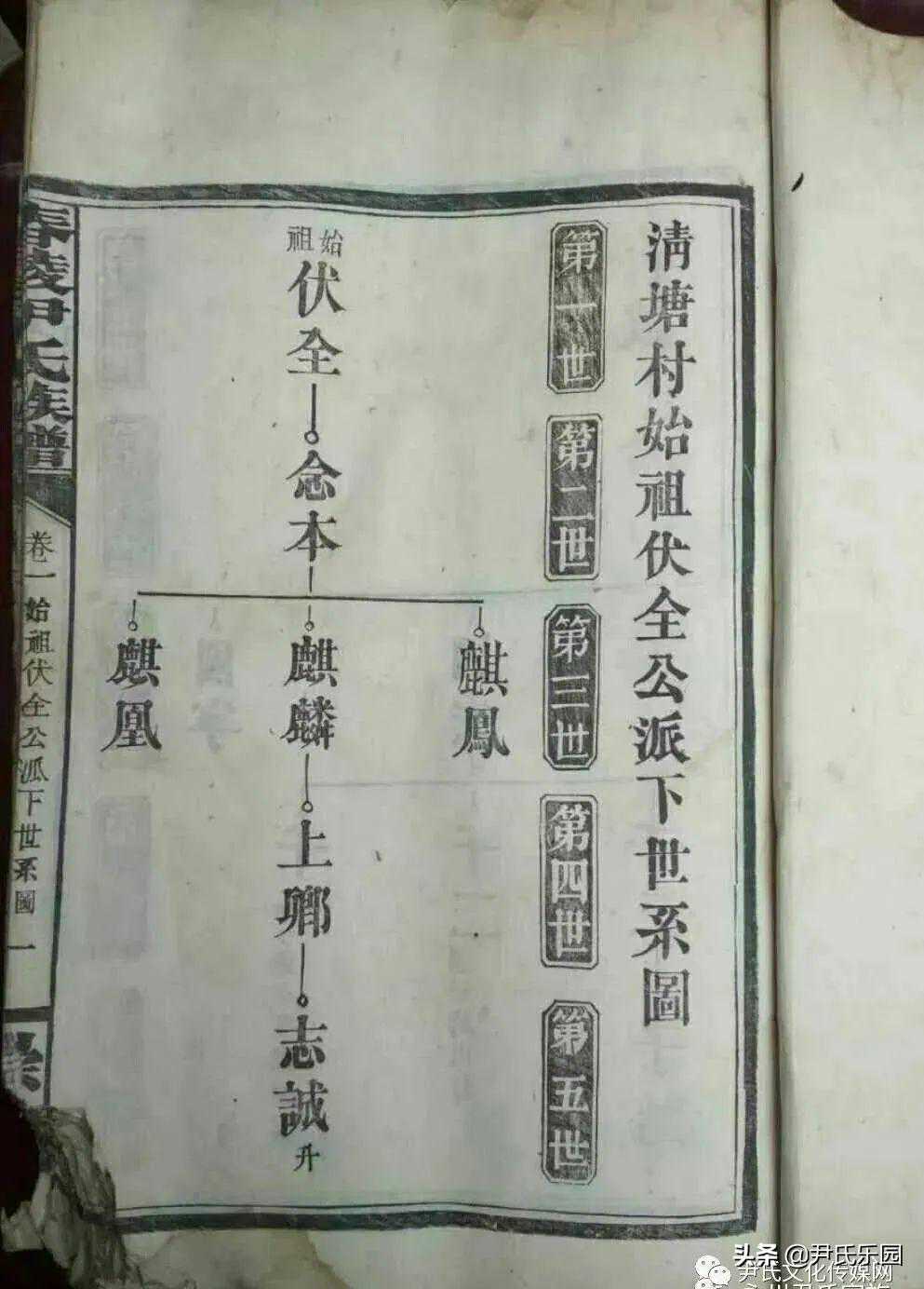 根据道县尹氏族谱记载:湖南永州府(零陵郡)道州(道县)尹氏伏全公(一世祖)原籍山东青州府,传念本,念本公生子三:麒麟、麒凤、麒凰。麒麟公,字天瑞,行三九,由茂才入仕,官至道州路总管。正值北宋靖康之变,山东沦陷,麒麟公无法返回原籍,卒于任上,卜葬于道州宜阳乡青口。麒麟公配朱氏,生子一:上卿。上卿公徙居永明桃川,传志诚,志诚传希禹,希禹公生子四:国安、国宁、国宝、小十。国安公生子三:千一、千二、千三。元末战乱,千一、千二、千三兄弟避难于道州清塘,等到明朝建立,天下太平,千一、千二兄弟返回桃川,只有千三公留居道县清塘。