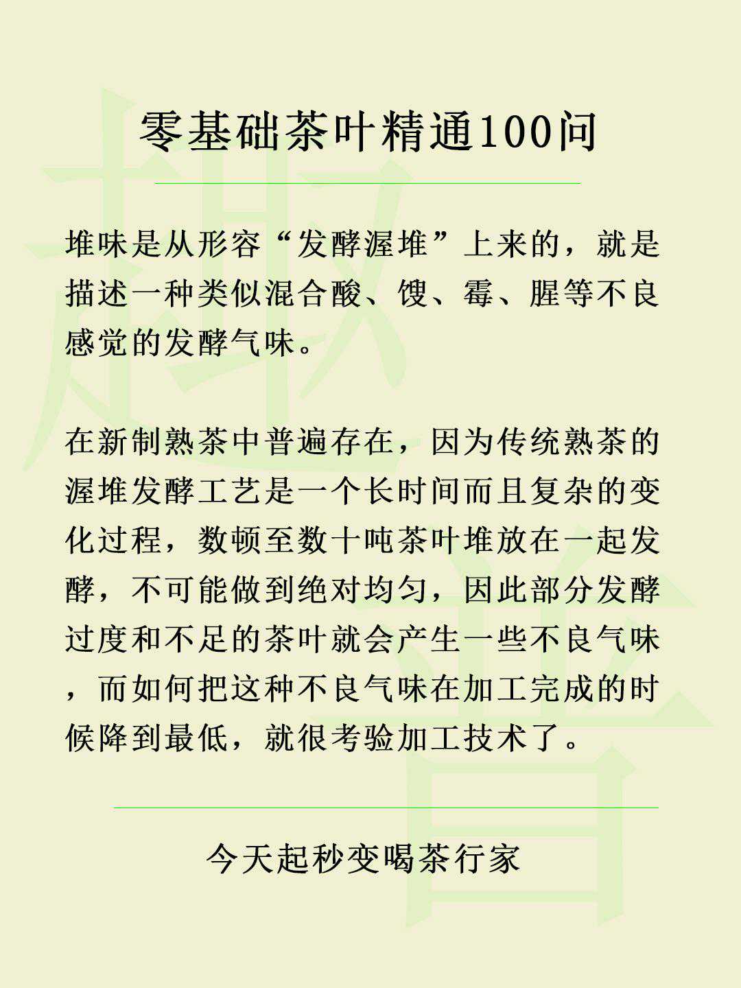 堆味是从形容“发酵渥堆”上来的,就是描述一种类似混合酸、馊、霉、腥等不良感觉的发酵气味。在新制熟茶中普遍存在,因为传统熟茶的渥堆发酵工艺是一个长时间而且复杂的变化过程,数顿至数十吨茶叶堆放在一起发酵,......