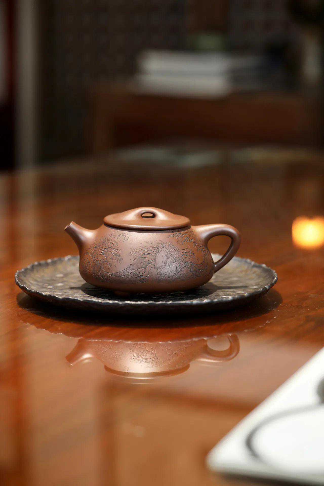 壶身形似秤砣,尽显大气稳重,线条流畅而富有韵律感,颈、肩、腹、足,顺势而下,似乎一个有诚笃而自傲的商人,安坐店肆之内,想像于千里之外。