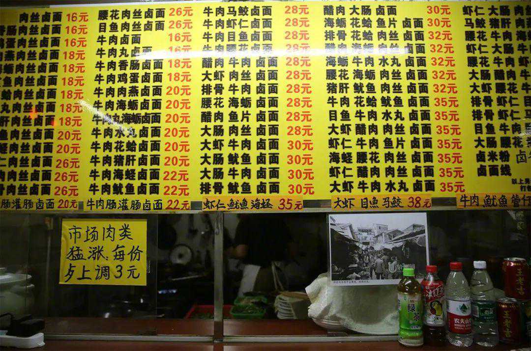 经常出现在宴席上的卤面也很混搭。一走进花巷的泉府卤面馆,映入眼帘的菜单晃眼又紧凑,肉类、海鲜、内脏、羹丸排列组合,足足有72般变化。