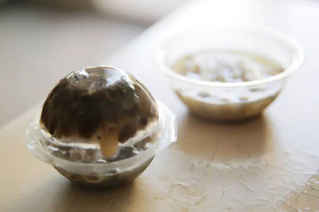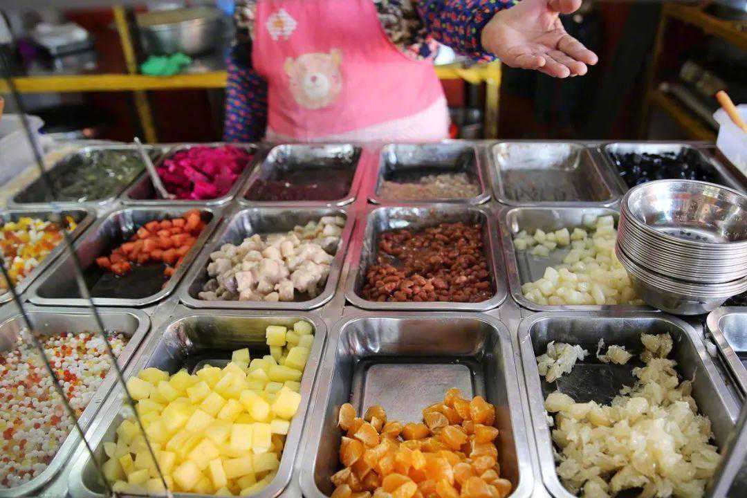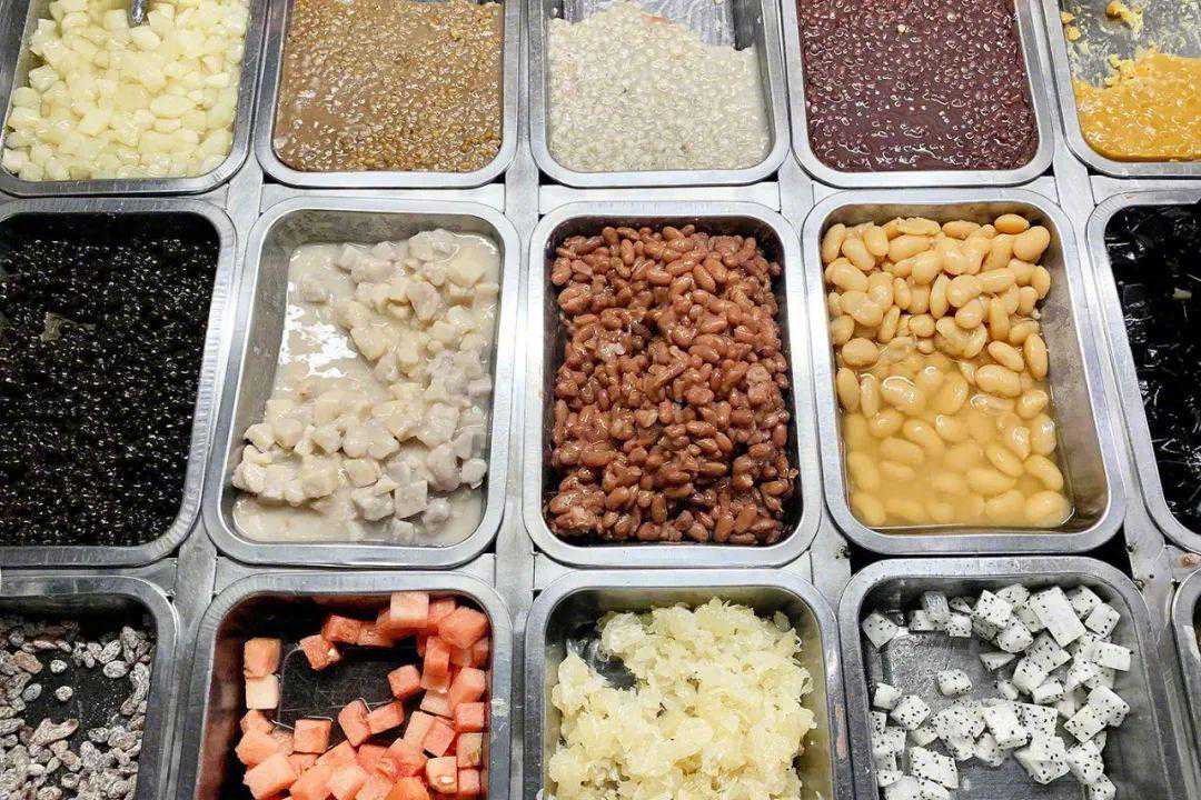 剩余的料头可以分为蜜豆类、粿子类和水果类。蜜豆类除了蜜红豆、蜜绿豆、蜜芸豆,也包含了蜜芋头、蜜薏仁和银耳,粿子类是地瓜粉、木薯粉做的阿达子、珍珠、仙草冻等,水果类则跟着季节来。