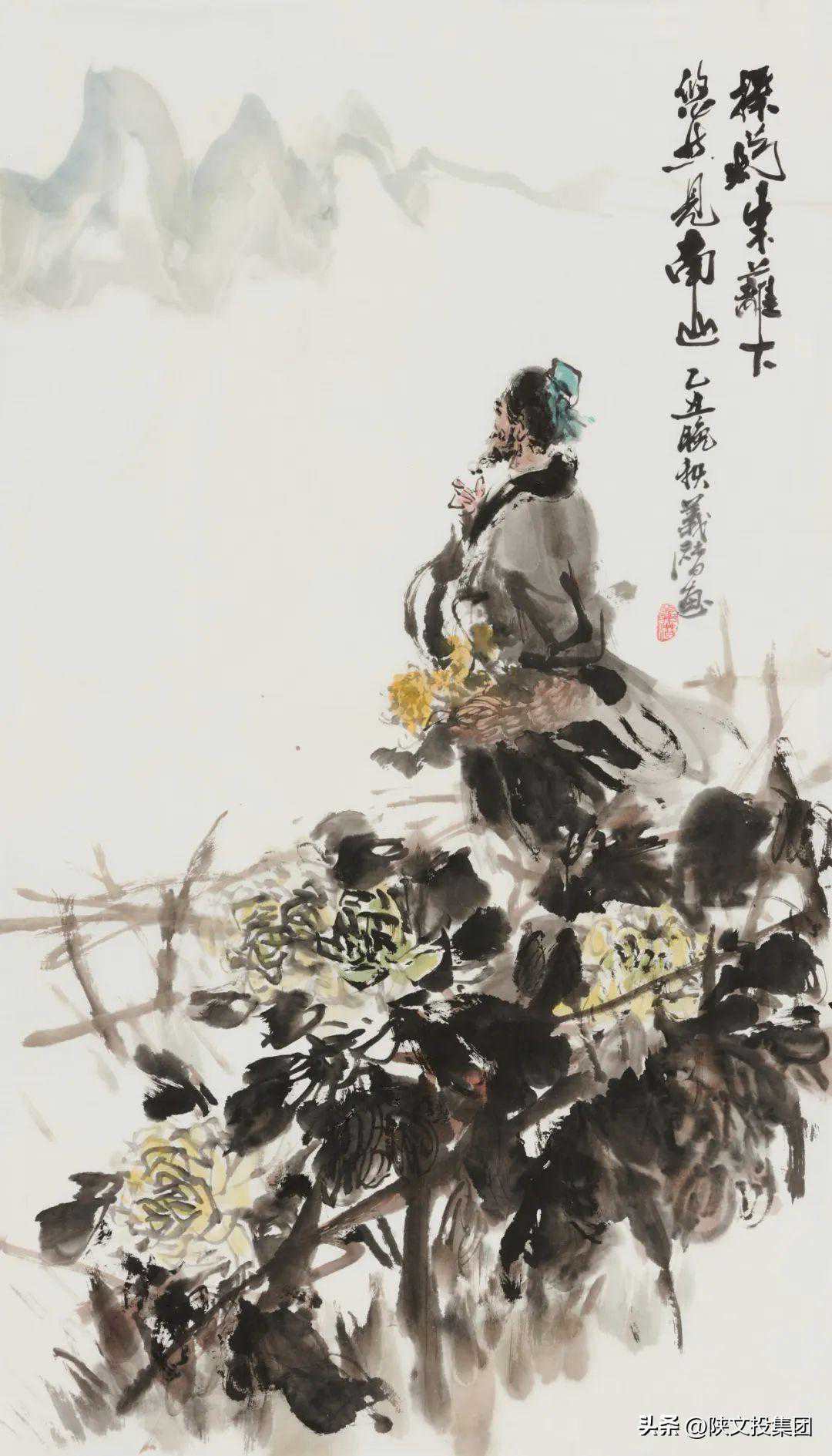 款识:采菊东篱下,悠然见南山。乙丑晚秋,义潜画。
