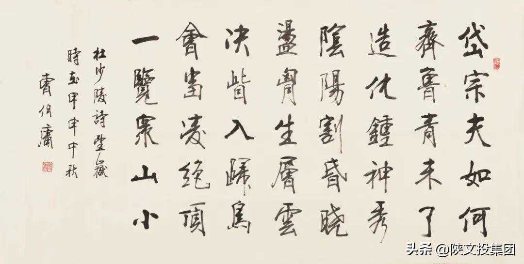 释文:岱宗夫如何?齐鲁青未了。造化钟神秀,阴阳割昏晓。荡胸生曾云,决眦入归鸟。会当凌绝顶,一览众山小。