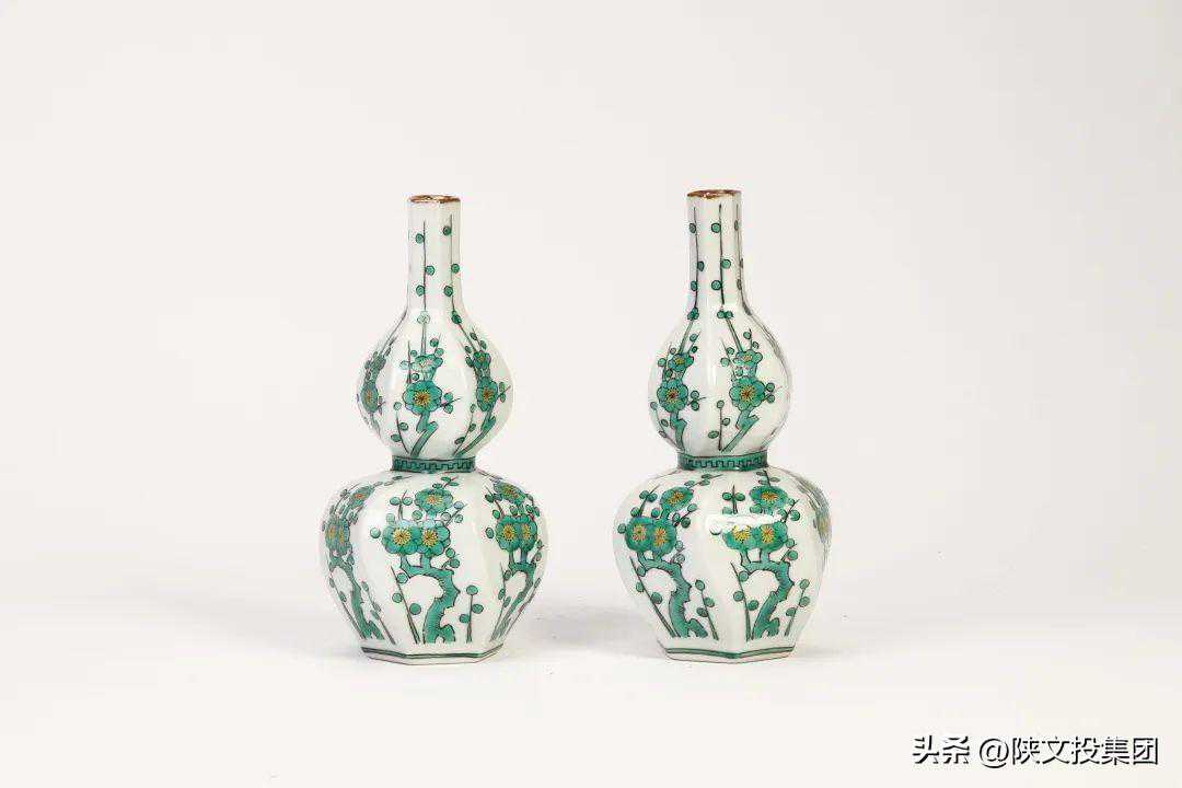 九谷峰泉绿交趾釉八方葫芦瓶一对
