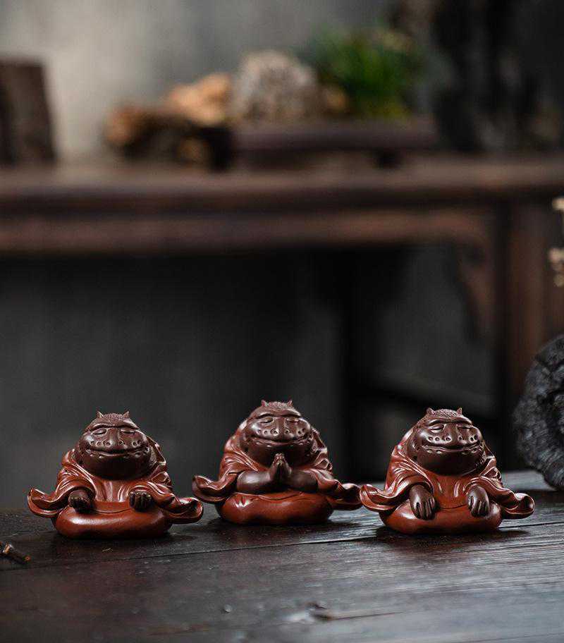 紫砂茶宠,顾名思义,是以紫砂为材质制作的茶宠。紫砂,这种产自江苏宜兴的特种陶土,因其独特的双气孔结构,具有良好的透气性和吸水性,能够吸收茶汤中的养分,逐渐发生变化,呈现出岁月留下的痕迹。因此,紫砂茶宠的养护过程,实际上也是一个与之共同成长、互相陪伴的过程。
