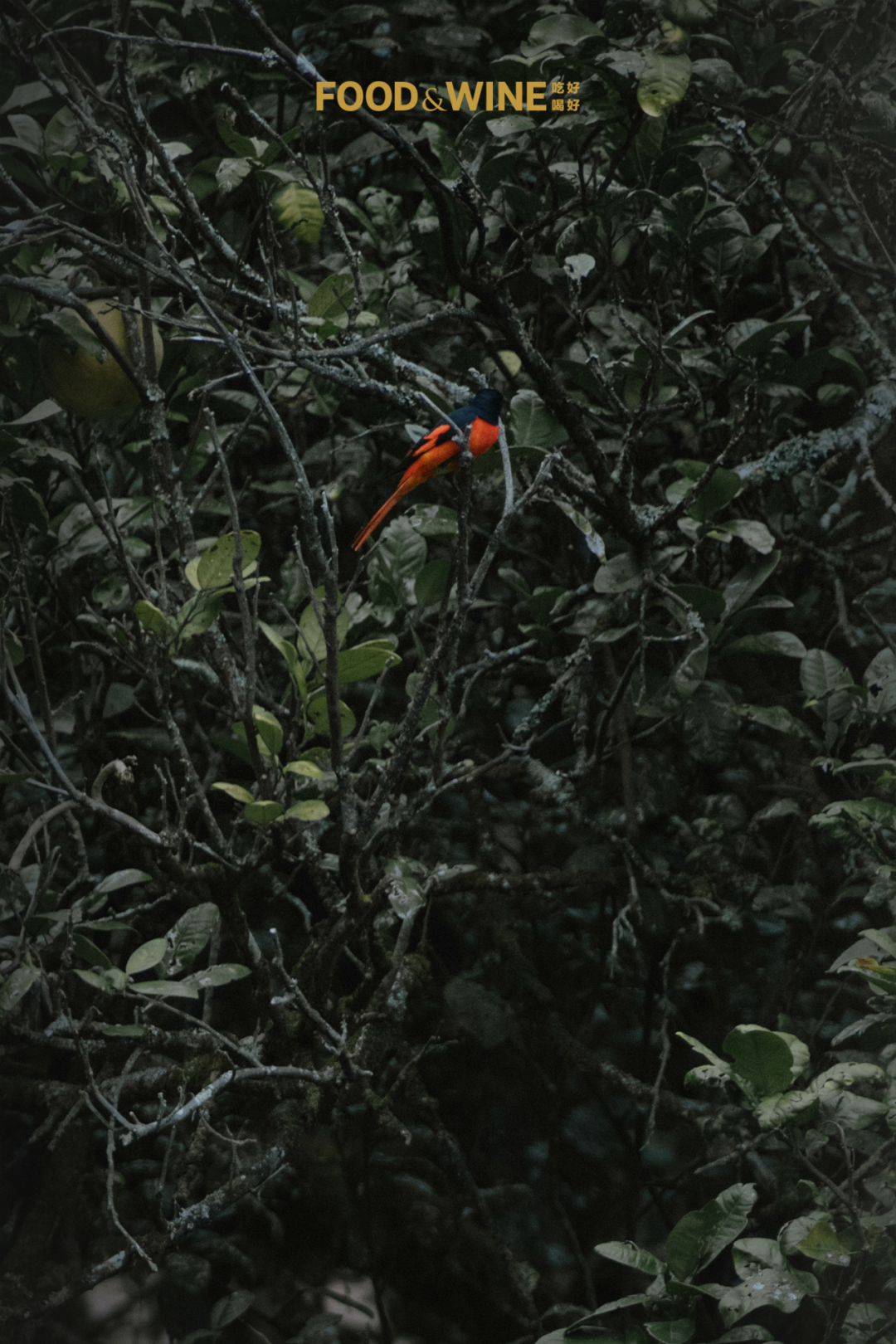 茶树间成群的山椒鸟,雄性呈现赤红羽翼。