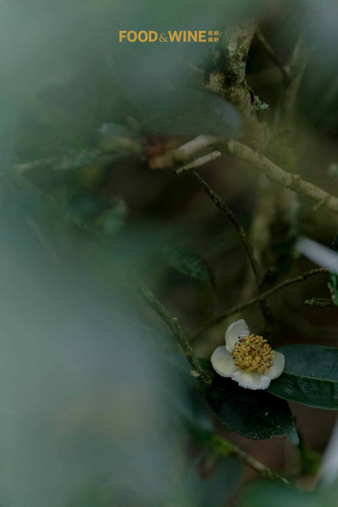 林老师提着一匣子茶具,一桶矿泉水,引我们在巨大百年老树下坐下,烧水煮茶。在山场里喝茶,茶桌上插着一枝从茶园里折下的白梅,更有种「本来如此」的意味。「马肉」出水快,头汤两秒钟就能泡好,岩茶中富含的茶多酚、氨基酸令茶汤鲜亮,而玫瑰金的汤色,便是一整座山场中的小气候,梅花、苔藓、岩石、土壤、流水。山的回应,已渐渐在杯中明了。