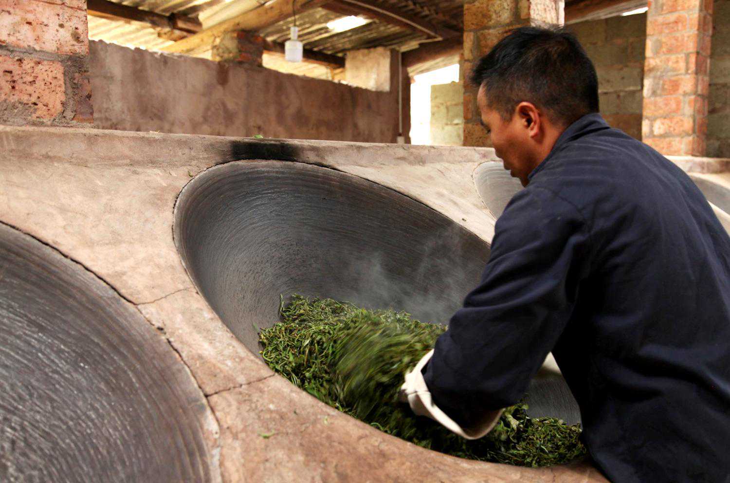 所谓杀青,就是普洱茶鲜叶采摘之后,待萎凋槽中的鲜叶摊青失水率达到70%左右(借鉴绿茶)之后,就可将其放入铁锅中进行手工炒制(ps:因此通俗一点来说,也称茶叶杀青为炒茶)。
