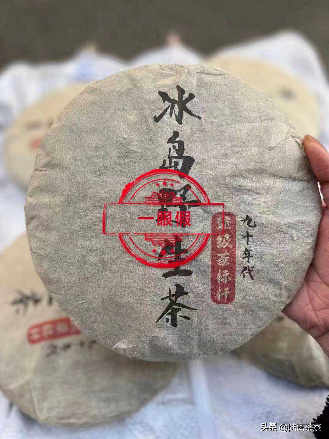 野生茶也是假茶上最常出现的字样之一,比如下图这款所谓的“90年代冰岛野生茶”,不仅忽略了当时整个勐库茶区都在做滇红的历史,而且将“野生茶”的最早出现时间向前挪移了整整十年,还画蛇添足地加了“号级茶标杆”,可以说是没一个字是真的。
