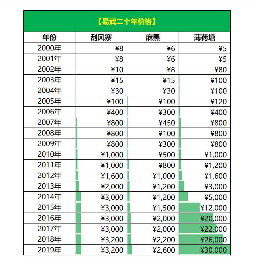 大家可以非常明显看出,三个寨子的价格,薄荷塘一骑绝尘,这就是物以稀为贵,资本的力量,这还是只是茶农卖给茶商的价格,茶商再出去的价格都差异很大了。