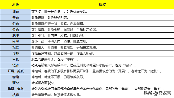 最后小懂为大家整理了一些审评时对于叶底描述的常用语,希望对大家日后品茶、购茶有所帮助。