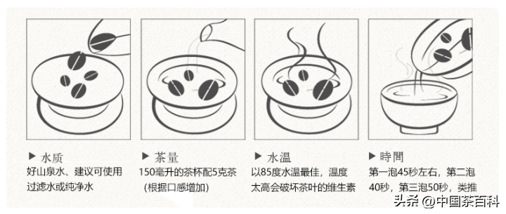 冲泡方式:热冲泡——选择传热、散热快的冲泡器,以瓷壶较佳。水温不宜过高,80-90℃为宜;冷冲泡——4克茶叶泡600毫升常温的水,冷藏6-8小时后可饮用。